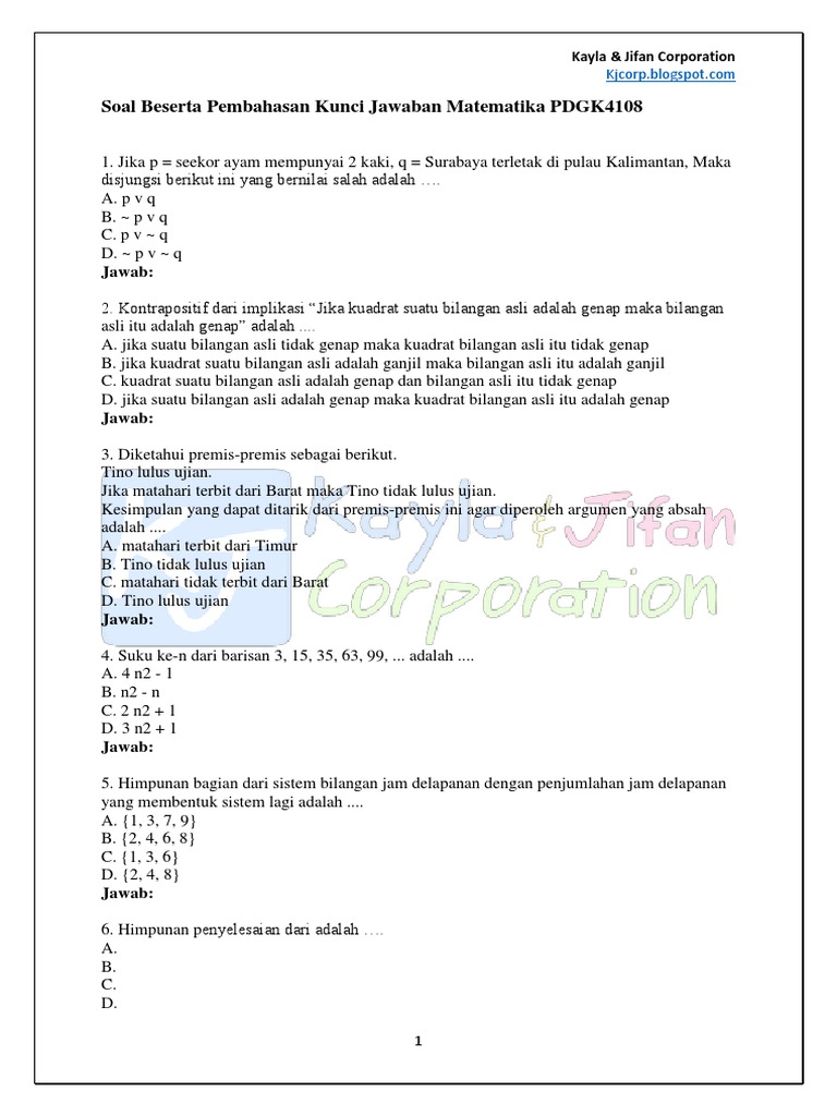 Download Soal Ujian Ut Pgsd Tugas Akhir Program Votelasopa from votelasopa368.weebly.com Soal ujian ut pgsd pdgk4208 pendidikan jasmani dan olahraga soal ujian ut pgsd yang kami bagikan ini bisa anda pelajari melalui smartphone anda langsung, dimanapun dan kapanpun asalkan anda terkoneksi dengan internet, sangat praktis sekali. Jika p = seekor ayam mempunyai 2. Karena disini kami tidak memisahkan antara soal dan jawabannya. Pdgk 4108 tutorial ke 8 1 disjungsi, implikasi, dan biimplikasi. Wikipedia pendidikan download soal ujian ut pgsd pdgk pendidikan belajar mahasiswa. Sekian artikel kami terkait paket soal ujian ut universitas terbuka beserta kunci jawaban semoga soal soal yang kami bagikan bermanfaat untuk anda. Soal ujian ut pgsd pdgk4403 pendidikan anak di sd beserta kunci jawaban kami bagikan untuk anda mahasiswa ut universitas terbuka jurusan s1 pgsd pendidikan guru sekolah dasar. Jika p = seekor ayam mempunyai 2 kaki, q = surabaya terletak di pulau kalimantan, maka disjungsi berikut ini yang bernilai salah adalah ….